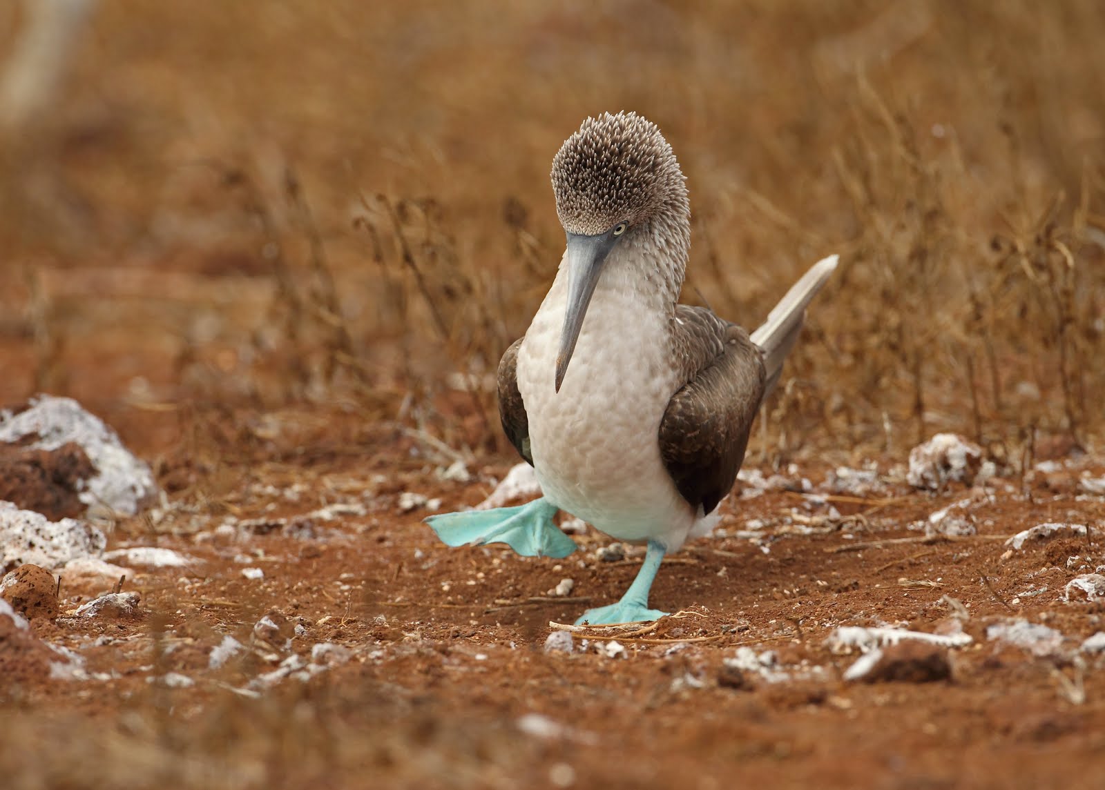 Tämä lintu on koiras, mutta naaras kurkottelee taivaalle samalla lailla. Sinijalkasuulan sukupuoli määritetään iriksen koosta, joka on naaraalla suurempi kuin koiraalla.